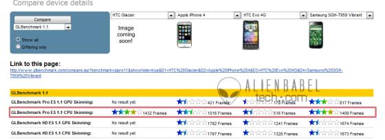 The benchmark above shows the HTC Glacier running at 1432 frames per second, which is three times faster than the HTC Evo 4G. Interestingly, this is 1.4 times faster than the Apple iPhone 4, which is impressive in itself, but on a par with the Samsung Vibrant – also known as the Samsung Galaxy S, and which is running Samsung’s own Hummingbird processor clocked at 1GHz.
